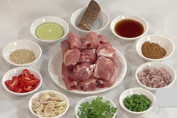 – Ướp sườn với 1M giấm đỏ, 1/2m hạt nêm Aji-ngon®, 1/2m tiêu, 1/2m đường, hành lá, 1/3 chén nước om sườn trong vòng 5 phút